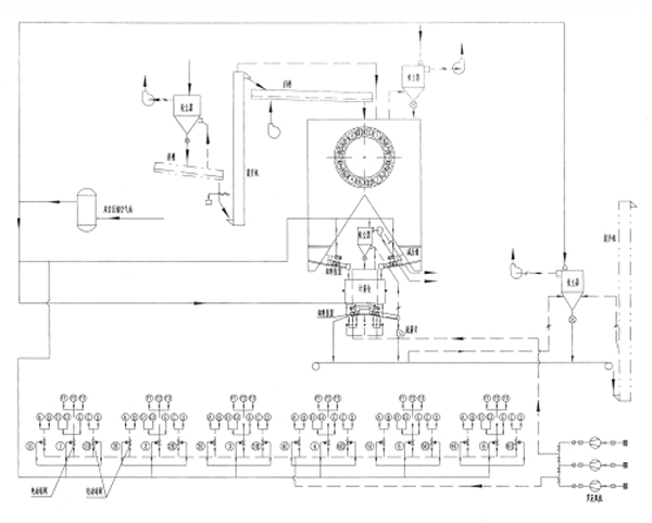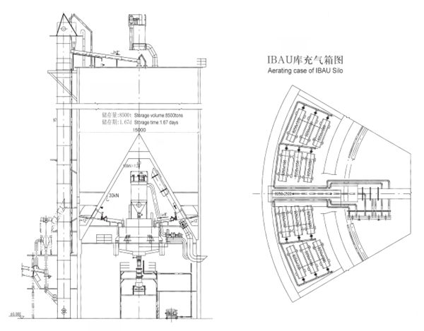 I B A U 均化庫(kù)是采用德國(guó)伊堡公司的連續(xù)均化技術(shù),經(jīng)國(guó)產(chǎn)化設(shè)計(jì)在水泥行業(yè)得到廣泛的應(yīng)用。均化庫(kù)的庫(kù)底中心設(shè)一大圓錐,庫(kù)內(nèi)生料的重量通過(guò)該錐體傳遞給庫(kù)壁,庫(kù)底環(huán)形空間分成向中心傾斜10°的6 個(gè)(或多個(gè))充氣區(qū),每個(gè)充氣區(qū)設(shè)一個(gè)卸料口,卸料口的上方用一個(gè)徑向放置的減壓錐將料層隔開(kāi),不讓卸料口上方的料流直接進(jìn)入卸料口,整個(gè)環(huán)形區(qū)生料在各區(qū)中有兩個(gè)以自上而下切割水平料層的流動(dòng)而產(chǎn)生重力混合均化的料柱,再經(jīng)卸料口兩側(cè)形成料流的對(duì)流混合流向卸料口,圓錐下設(shè)外攪拌倉(cāng),各區(qū)的生料循環(huán)進(jìn)入攪拌倉(cāng)后,經(jīng)連續(xù)強(qiáng)烈的充氣攪拌得到進(jìn)一步均化。均化比為6-8,耗電為0.1-0.2kW/t。